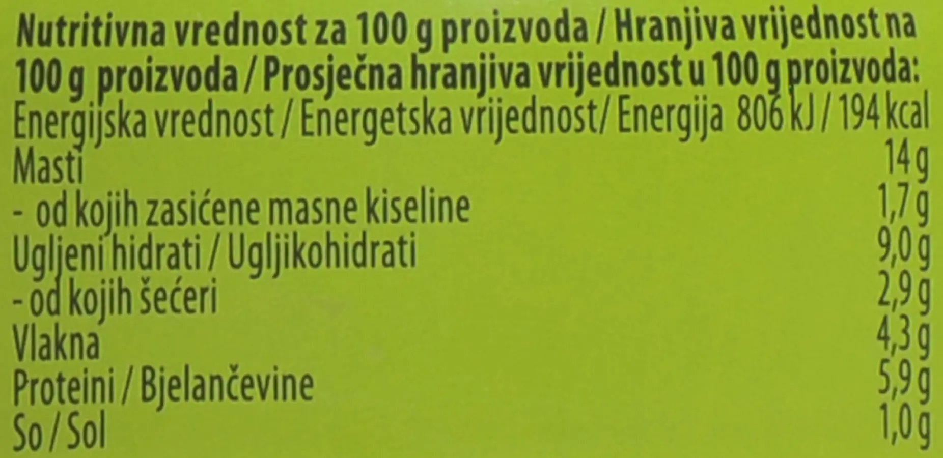 Kuhani slanutak 33 %, pečena crvena paprika 30 %, voda, biljno ulje (suncokretovo, repičino i sojino u promjenjivim udjelima), tahini (pasta od sezama), sjeme sezama, koncentrat limunovog soka, sol, češnjak, bijeli papar.