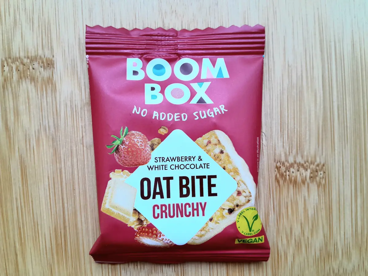 Pečeni zobeni granola zalogaj s jagodom, djelomično obložen kremom s okusom bijele čokolade bez dodanog šećera, sa sladilom.