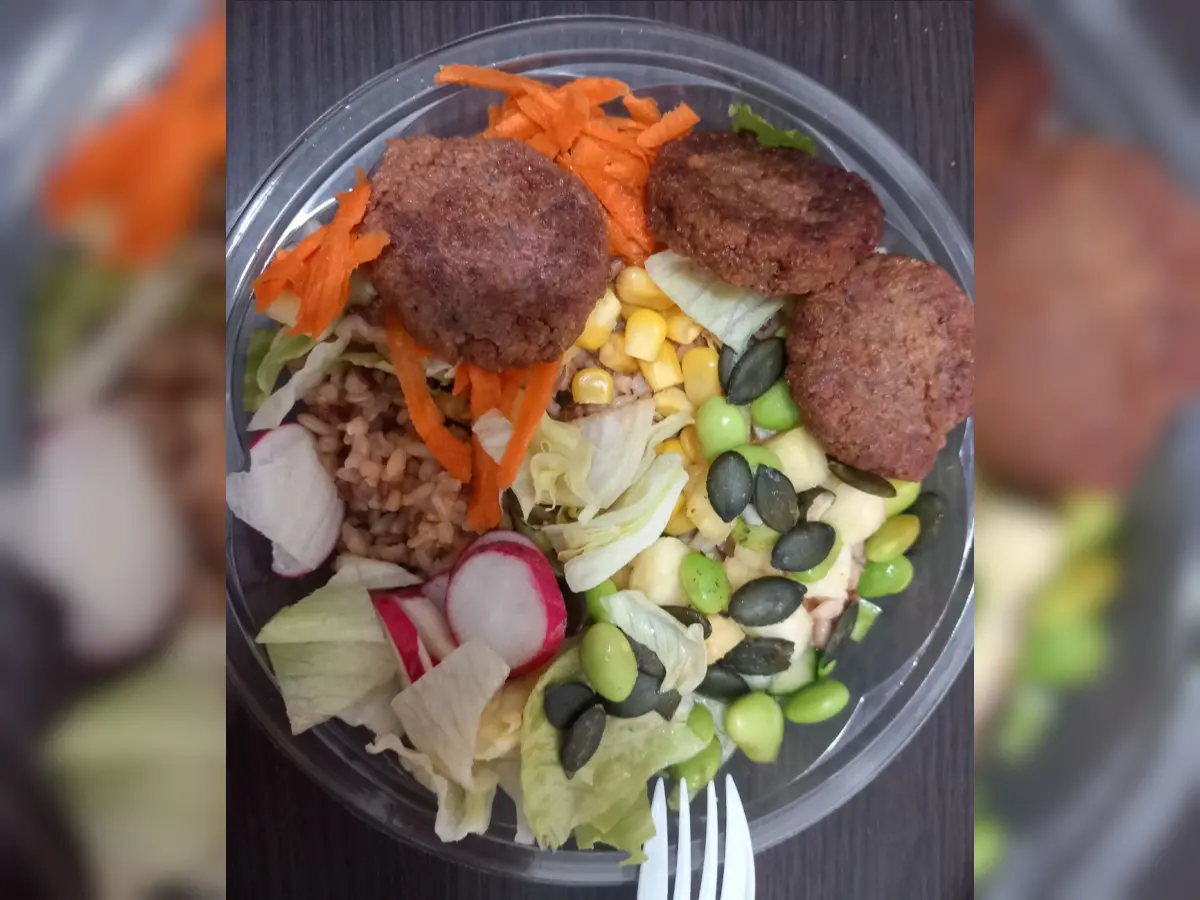 Osnova po izboru, đumbir sos, veganski burger, kukuruz, rotkvice, krastavac, iceberg salata, šargarepa, ananas, edamame, seme bundeve.